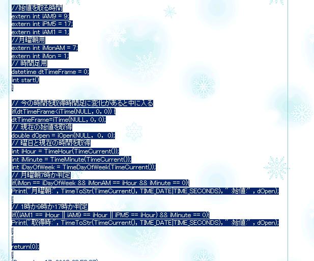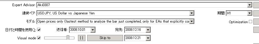 FXに人生を賭ける男さんのブログに貼り付けた値取得用のEAで コンパイルから実行までの手順も書いてほしいと要望がありましたので以下に書いておきます 1.ブログより、EAロジック部分をコピーする 2.ブログに貼り付けると、カンマ(,)が全角になってしまうので、メモ帳に貼り付けて、全角カンマを 半角カンマに置き換える 3.MT4を起動して、メタエディターを立ち上げる (ツール->MetaQuotes Language Editor) 4.メタエディターが立ち上がったら、新規にファイルを作成する (File -> New) 5.ダイアログが出るので”Expert Advisor”にチェックがついてるか確認して次へボタンを押す 6.またダイアログが出てくるので”Name”に適当な名前をつけて完了ボタンを押す (今回はAki0307とつけてみました) 7.エディット画面がでたら、2.で編集したEAロジックを上書きしてCompileボタンを押す 8.画面下部に、画像のようにErrorが0と出たらコンパイル完了 9.MT4に戻って、バックテスト用の機能を表示する (表示 -> Strategy Tester_) 10.バックテスト用の設定をする Expert Advisor:EAの名前(今回はAki0307) 通貨ペア:USDJPY モデル:Open prices only 期間:H1 日付と時間を使用:チェックする 送信者:テスト開始日(今回は2008.10.01にしてみた) 宛先:テスト終了日(今回は2008.12.16にしてみた) 11.スタートボタンを押すと、テストが実行され操作履歴タブに結果が表示される 以上。このような感じになります このEAはほかのブローカー(ODLとか)にも対応できるようにプロパティ設定が可能です Expert properties というボタンを押すと、以下のダイアログが出てきます デフォルトは121証券に合わせております iAM9:午前9時のときのMT4上の時間 iPM5:午後5時のときのMT4上の時間 iAM1:午前1時のときのMT4上の時間 iMonAM:月曜朝のときのMT4上の時間 iMon:月曜日の曜日判定(MT4だと1が月曜で、0が日曜です) また、121証券だけかもしれませんが、ヒストリカルセンターから過去データを持ってくると 月曜朝7時のデータが取れなかったので、デモサーバーから直接過去データを取るのが よいと思います 1.MT4上で、オプションを表示する (ツール -> オプション) 2.チャートタブを表示して、ヒストリー内のバー最大数を設定(ALL9を設定するとMT4上の限界が設定されます) 3.USDJPYの1時間足を表示して、プロパティを表示 (チャート上の適当なところで右クリック -> プロパティ) 4.プロパティが出たら、全般タブを選んで”チャートの自動スクロール”のチェックをはずす 5.あとは、チャート上でキーボードのPageUpボタンを押し続けると、過去データを取得し続けます 以上。長々と書いていきました。 ご質問があれば、答えられる範囲でお答えしますので、お気楽にどうぞ(*'-') PR
