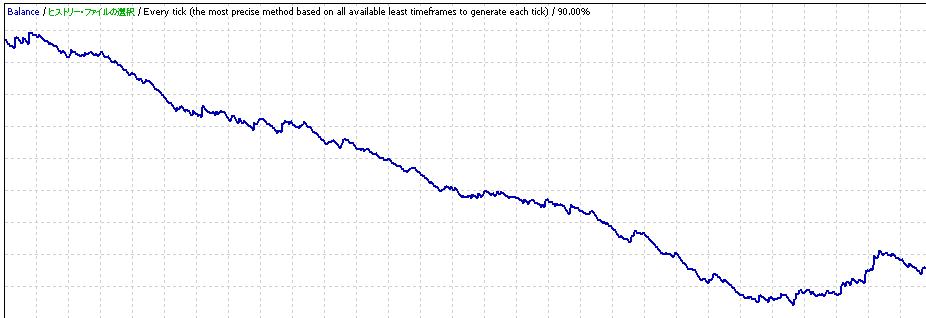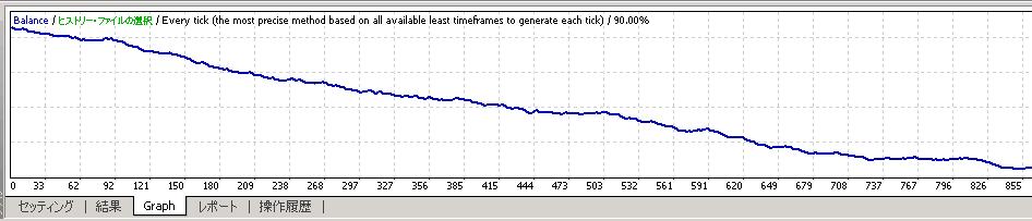 とうとう、実際に売買を行うEAを作成しました。 売買ルールの元ネタは某巨大掲示板に乗っていたこんなルールです。 ---------------------------------------------------------------------------------------- んじゃ晒すよ。 前スレから起点から逆指値で注文してリミット10ストップ40ってやり方について調べてたじゃん。 あのやりかたの変型版なんだけど。やり方としては、まず ペアはポン円。起点とする時間は日本時間の14時。14時に逆指値で上下20ピピにLSの注文を入れる。 それで、肝心なのがリミットとストップは入れないこと。っていうかトレールを使う。つまり、利はなるべく伸ばそうってこと。 1時間足のデータ見てると動くときはものすごい勢いで動いてるのがわかったからそういうときに10ピピだともったいないしね。 トレールは最初は25でじょじょにあげていく。 起点が210円だとしたら210.2にLの注文を入れて、トレールは25ピピ。210.55を超えたらトレール30ピピ。 210.70を超えたらトレール35ピピ、210.75以上はトレール40ピピ。 高値からトレール分下がったらストップになる。つまり、負けの場合20でエントリーされて1ピピも上がらずに25下がった場合でスプ入れて-30ピピ。 30まで上がって05まで下がった場合スプ入れて-20ピピの負けになる。 このトレールの数字とか時間、ペアには特に理由があって設定したわけじゃないけど、とりあえずこれで2008年の1月~6月まで1時間足で見てみた。 1月。22日でL19回、S22回エントリー。同値撤退以上の回数がL9回で合計154ピピ。Sが13回で480ピピ。1月トータルで634ピピ 2月。21日でL18回、S18回エントリー。同値撤退以上の回数がL5回で合計-68ピピ。Sが11回で444ピピ。2月トータルで376ピピ 3月。21日でL19回、S18回エントリー。同値撤退以上の回数がL9回で合計32ピピ。Sが5回で-119ピピ。3月トータルで-87ピピ 4月。22日でL19回、S19回エントリー。同値撤退以上の回数がL6回で合計23ピピ。Sが11回で316ピピ。4月トータルで339ピピ 5月。22日でL19回、S18回エントリー。同値撤退以上の回数がL10回で合計274ピピ。Sが8回で-1ピピ。5月トータルで273ピピ 6月。21日でL15回、S17回エントリー。同値撤退以上の回数がL2回で合計-142ピピ。Sが10回で606ピピ。6月トータルで466ピピ 半年合計でLが109回エントリー中41回プラス。合計273ピピ Sが112回エントリー中58回プラス。合計1728ピピ こんな感じの結果です。1月平均300ピピほどでした。 1時間足での検証なので、見えない部分もあり、本当はストップに刈られていたりもあるかもしれないですが。 トレール幅などは適当に決めたので変えれば結果はもっと良くなるかもしれないし、悪くなるかもしれません。 そして、トレールの幅をじょじょに上げていくため、エントリー中はチャートをずっと見て自分で変えていかないといけません。めんどいですが ご意見、質問などあればどんどんどうぞ。 おそらくこれだと思う。俺もこれで今勝ててる ---------------------------------------------------------------------------------------- つまりポン円で日本時間の14時の価格から+-20Pipずつにストップで売買注文を出す というルールですね (トレーリングストップも機能として必要だけど、それは後回しということで・・・) このルールを元にEAを作成しました ソースはこれ→ダウンロード(mq4) これをつかって、ポン円の15分足をつかって2007年1月1日から2008年12月31日までの バックテストをしてみましたよ。 結果はこれ↓ ん~。 見事な右肩下がり(´Д`;)ヾ 次からは、このEAを元にして、トレーリングストップとか色々な機能を付加していきたいと思います(*'-')