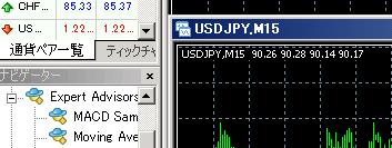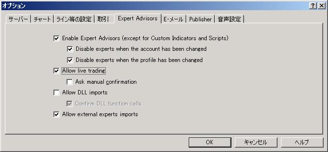 私が今まで出してきたのは基本的にバックテストが前提でのEAでしたが リアルタイムで動かすこともできますので、そのやり方になります。 ※ライブ口座でこれをやると本当にEAが稼動して売買されてしまう可能性があるので注意です! 事前準備として、 1.MT4のオプション画面を表示する。 (ツール->オプション) 2.オプション画面が出たら「Expert Advisors」タブを開いて、画面のようにチェックを入れる をやってください。 で、実際のEA実行方法というと 1.MT4上で新規にチャートを開く(今回はUSDJPYを選択します) (ファイル->新規チャート) 2.チャートを開いたら、そのチャートに対して使いたいEAをドラッグ&ドロップします (ナビゲータウィンドウ->Expert Advisorsの中から選択今回はMACD sampleを選んでいます) 3.ダイアログが出てくるので、適当に設定します。 (全般タブは画像のように、パラメータの入力タブは適当に) 4.ダイアログでOKを押して、チャートの右上にニコチャンマークが出てきたら正常に稼動しています チャートの右上がニコチャンマークじゃない場合、事前準備での設定があっていないと思うので チェックボックスを合わせてみてください 以上。今回はここまでで。 ご質問があれば、答えられる範囲でお答えしますので、お気楽にどうぞ(*'-')